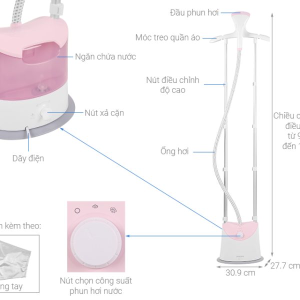 Thiết kế dạng đứng với chiều cao có thể tùy chỉnh dễ dàng giúp ủi quần áo đang treo, rèm cửa, khăn màn,… tiện lợi, nhanh gọn.