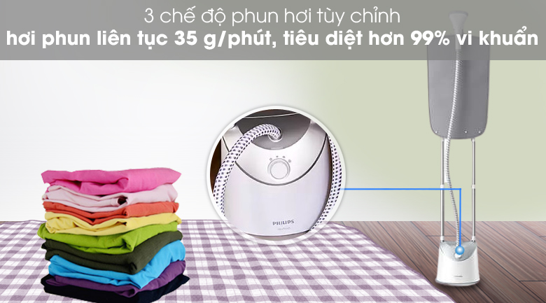3 chế độ phun hơi cho phép tùy chỉnh tùy theo loại vải, với hơi phun liên tục 35 g/phút làm phẳng mặt vải chỉ với vài đường ủi