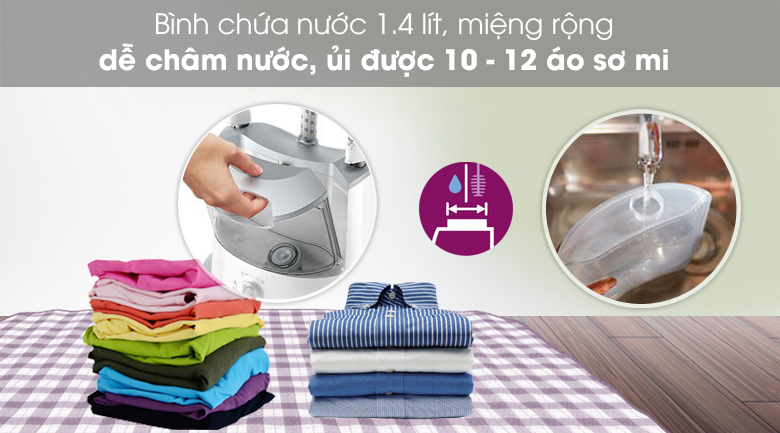 Dung tích bình chứa nước 1.4 lít cho thời gian sử dụng liên tục dài, không phải gián đoạn châm nước, tiết kiệm thời gian