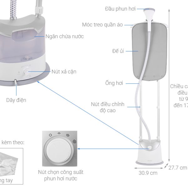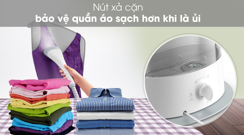Bàn ủi hơi nước đứng tích hợp nút xả cặn để làm sạch bình chứa và hệ thống dẫn hơi, đảm bảo hơi nước ra tinh khiết, tránh gây ố vàng trên quần áo