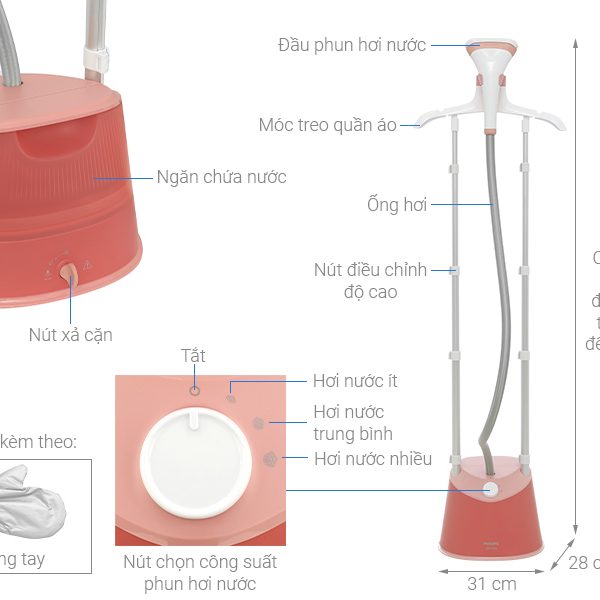 – Bàn ủi hơi nước đứng có khối lượng tay cầm tương đối nhẹ, dây điện có chiều dài 158 cm dễ dàng kết nối với nguồn điện khi ủi hay di chuyển qua lại.