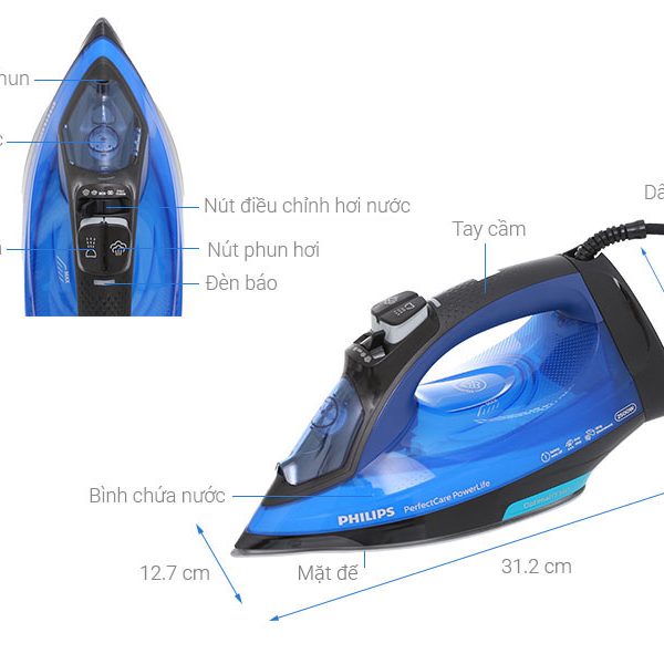 Ủi hơi nước: Phun hơi liên tục 45 g/phút.