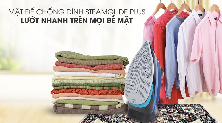 Mặt đế chống dính SteamGlide Plus – độc quyền của Philips, được tráng 6 lớp chống ăn mòn, chống trầy cực bền tốt, lướt nhẹ và êm ái trên mọi chất liệu vải, làm sạch đơn giản khi cần