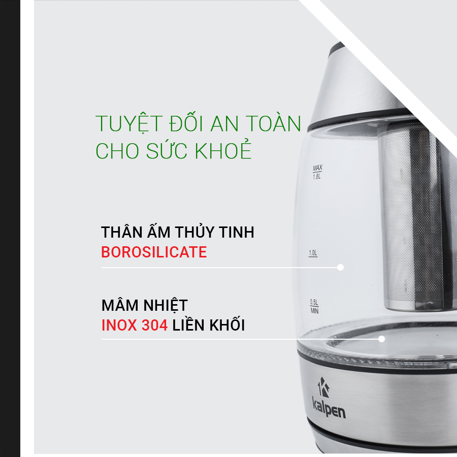 An Toàn: Được làm từ thủy tinh borosilicate glass sử dụng cho thiết bị bảo quản thực phẩm trong nấu nướng và thiết bị y tế nên tuyệt đối an toàn cho sức khỏe. Phần gia nhiệt được làm từ Inox 304 liền khối cao cấp an toàn và không gây độc hại.