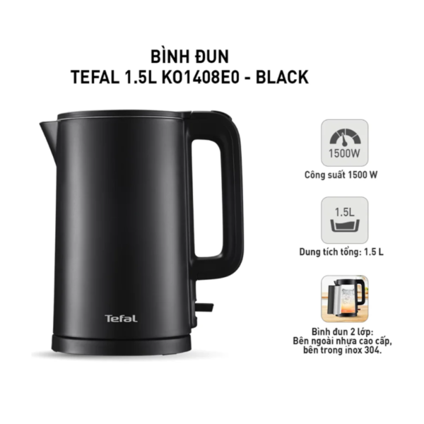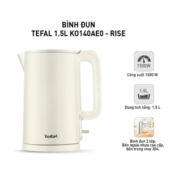 Bình Đun Siêu Tốc Tefal KO140AE0 1.5 Lít bên ngoài nhựa cao cấp, bên trong inox 304 đẹp thời thượng. Công suất 1500W cho thời gian nấu nước nhanh. Đế xoay 360 độ nên người dùng có thể đặt ấm lên hay nhấc ấm ra khỏi đế ở bất cứ góc nào mà không phải lo lắng đến vấn đề phải đặt sao cho khớp.