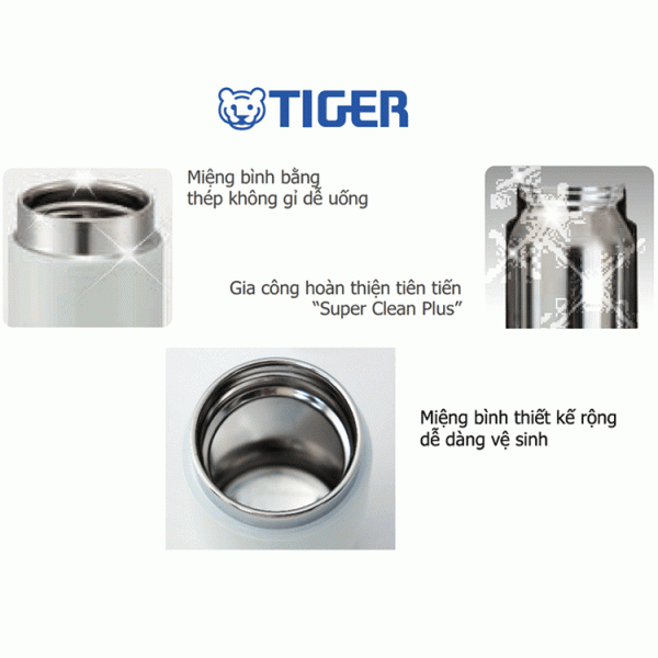 Miệng bình lưỡng tính Tiger MBI-A080 được làm bằng thép không gỉ và rộng đến 4.5cm dễ dàng rót ra nắp (với thiết kế theo dạng ly cách nhiệt) cũng như thuận tiện vệ sinh. Người dùng có thể thoải mái bỏ những viên đá lớn, giúp đá lâu tan hơn. Lưu ý, vệ sinh bên ngoài bình của model này bằng khăn nhà bếp đã vắt khô nước.