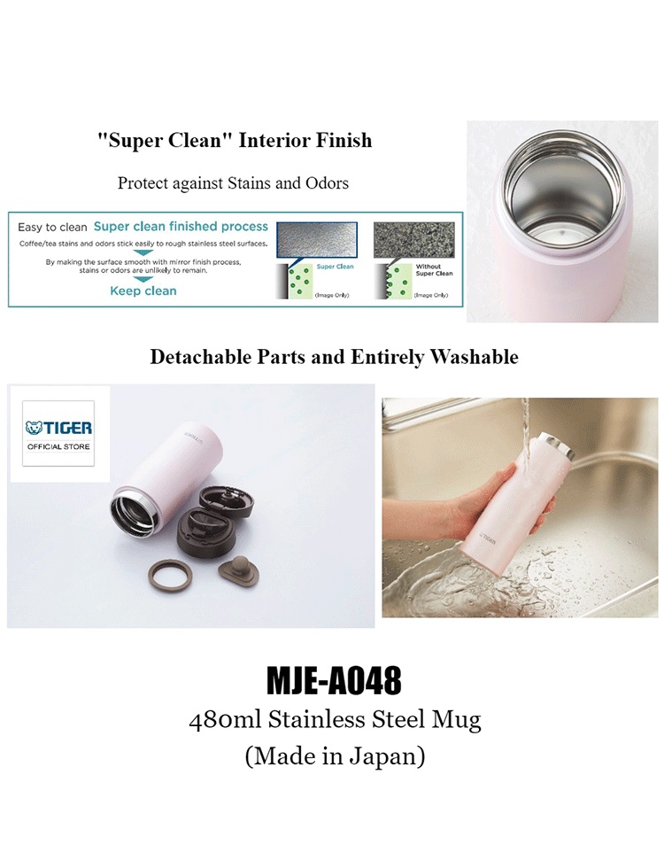 Toàn bộ cấu trúc bình lưỡng tính Tiger MJE-A048 làm từ thép không gỉ tiêu chuẩn SUS304 (18/8) được áp dụng công nghệ “Super Clean Plus” chống gỉ sét, chống ăn mòn, chống dính, chống bám bẩn, khử mùi và dễ dàng vệ sinh ngay cả những thức uống dễ để lại vết bám bẩn và mùi như cà phê / trà mà không gây ra những chất độc hại cho sức khỏe của người sử dụng.
