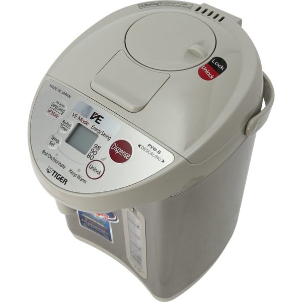 Bình thủy điện tử chân không Tiger PVW-B30W có thiết kế nhỏ gọn, phù hợp với nhiều không gian nội thất của gia đình hay văn phòng, công ty. Vỏ bình được làm bằng inox viền cà phê sữa, chịu nhiệt và lực tốt, hạn chế bị biến dạng khi có va chạm, có độ bền cao. Để luôn có sẵn nước nóng mà không mất thời gian đun nước rót vào phích, bình thủy điện là giải pháp được nhiều gia đình lựa chọn.