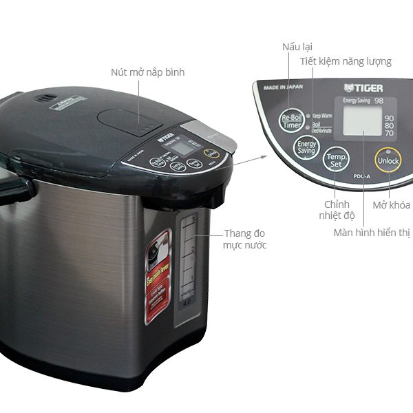 Bình thủy điện Tiger có chế độ đun sôi, giữ nóng ở 4 mức nhiệt độ là 70, 80, 90 độ C và 98 độ C