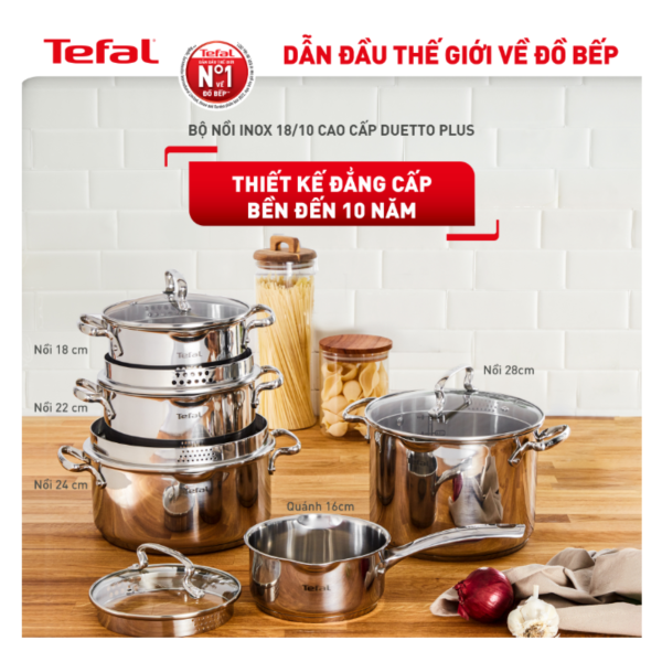 Bộ 3 nồi inox cao cấp Tefal Duetto Plus (Nồi cán dài 16cm – 1.4L, Nồi 20cm – 2.8L, Nồi 24cm – 4.9L)