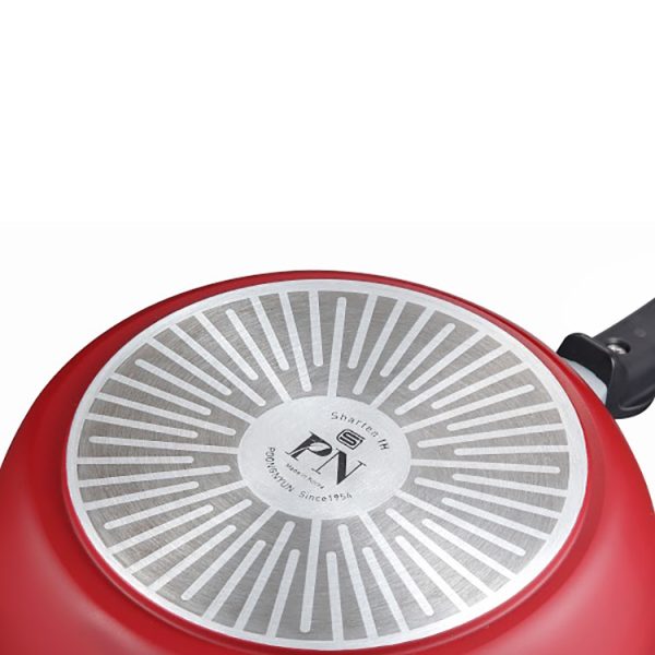Chảo nhôm (loại chảo cạn) từ tính hiệu PoongNyun Series Shah Murten màu đỏ được đúc từ nhôm 3.0T và Inox 430 0.5T, bên trong chảo phủ lớp men Quantanium chống dính, bên ngoài phủ lớp men chống dính, tay cầm được làm bằng nhựa tổng hợp, Sử dụng được trên bếp gas, bếp hồng ngoại, bếp từ.