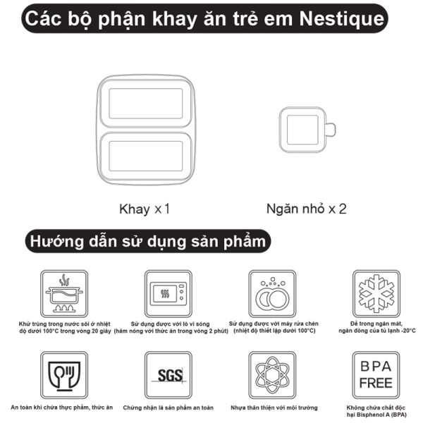 Khay ăn trẻ em cao cấp hiệu Nestique N-12 được làm bằng vật liệu chịu nhiệt cho phép sử dụng lò vi sóng với mục đích hâm nóng – Hâm nóng trong vòng 2 phút với nước hoặc thức ăn và lưu trữ trong ngăn mát, ngăn đông của tủ lạnh ở nhiệt độ -20°C. Ngoài ra, có thể rửa khay ăn trẻ em trong máy rửa chén ở nhiệt độ dưới 100ºC hoặc có thể thuận tiện làm sạch bằng cách trần trong nước nóng ở nhiệt độ dưới 100°C trong 20 giây (Khi nước đã sôi thì tắt bếp và trần qua). Không sử dụng trong lò nướng, nồi hấp, nồi chiên không khí, vĩ nướng và giấy bạc. Có thể bị đổi màu khi dùng thực phẩm có màu đậm nhưng nếu phơi khay, bát, dĩa dưới nắng sau khi rửa nhẹ thì hầu hết sẽ trở lại màu sắc ban đầu. Khay ăn trẻ em cao cấp hiệu Nestique N-12 được làm từ nhựa thân thiện môi trường vừa là nguyên liệu gần gũi của tái sinh – nguyên liệu có thể tái chế sử dụng lại tài nguyên và tận dụng đồ phế thải, vừa là sản phẩm có thể tái chế nên có chức năng 3R : Reuse (Tái sử dụng lâu dài) – Reduce (Giảm thiểu rác thải nhựa) – Recycle (Sử dụng cho mục đích khác) – Upcycling (Tái chế thành sản phẩm khác). Nhiều bậc cha mẹ có xu hướng cân nhắc kỹ lưỡng khi mua khay ăn dặm cho con và họ sẽ phải mua các khay ăn với nhiều kích cỡ khác nhau và lo lắng về việc lưu trữ quá nhiều bộ dụng cụ ăn uống. Khay ăn trẻ em cao cấp hiệu Nestique N-12 có thể giải quyết những vấn đề này bằng cách cung cấp một thiết kế đa năng để sử dụng thực tế. Nó cũng dễ dàng xếp chồng lên nhau, giúp bạn tiết kiệm rất nhiều không gian trong nhà bếp. Bạn cũng có thể sử dụng các ngăn đựng đĩa để tạo nên những sự kết hợp độc đáo. Hơn nữa, sản phẩm có các chấm silicon hít chân không chống trượt được thiết kế ở phía dưới đáy khay để tạo sự ổn định khi bé đang sử dụng. Khay ăn trẻ em cao cấp hiệu Nestique N-12 làm từ vật liệu ECOZEN chủ yếu được áp dụng cho hộp chứa đựng thực phẩm và đồ gia dụng giúp không bị bám mùi thực phẩm ngay cả khi bảo quản thực phẩm có tính axit cao hay cà ri trong thời gian dài; Màu thực phẩm không dễ đọng lại trên đĩa do vật liệu của nó có khả năng chống nhiễm màu cao. Ngoài ra, khay ăn cho bé của chúng tôi kháng hóa chất và an toàn khi sử dụng với tất cả các chất tẩy rửa bao gồm chất tẩy rửa có tính kiềm, chất tẩy rửa trung tín và chất tẩy gốc oxy giúp bạn dễ đàng vệ sinh sau khi sử dụng.Khả năng chịu nhiệt tốt phù hợp sử dụng với lò vi sóng, máy rửa chén, ngăn đông tủ lạnh