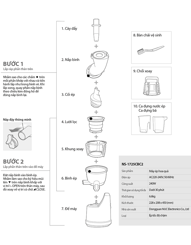 Máy ép trái cây tốc độ chậm Kuvings NS-1725CBC2 dung tích 400ml có thiết kế nhỏ gọn, nhiều màu sắc trẻ trung, sang trọng, hiện đại và an toàn luôn luôn có mặt trong mọi không gian nhà bếp. Bên cạnh đó, với cấu tạo từ linh kiện cao cấp và nhựa thân thiện môi trường, cứng cáp, bền bỉ và chịu nhiệt tốt giữ máy ép trái cây tốc độ chậm lâu phai màu, không mau dơ với độ bền cao theo thời gian sử dụng. Ngoài ra, máy ép trái cây tốc độ chậm Kuvings có dụng cụ vệ sinh (chổi xoay và bàn chải), ca đựng nước ép và ca đựng bã ép kèm theo sản phẩm giúp bạn vệ sinh nhanh chóng và dễ dàng sau mỗi lần sử dụng máy ép.