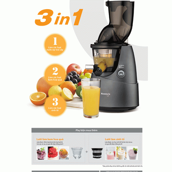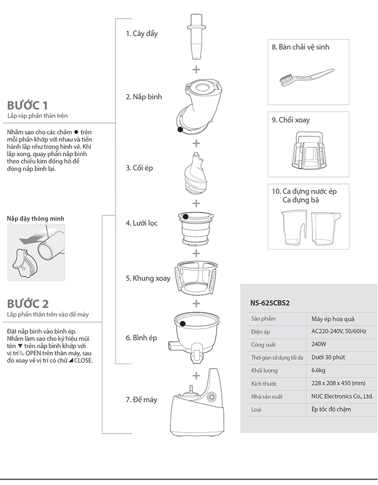 Máy ép trái cây tốc độ chậm Kuvings NS-625CBS2 dung tích 400ml nhập khẩu từ Hàn Quốc có thiết kế nhỏ gọn, nhiều màu sắc trẻ trung, sang trọng, hiện đại và an toàn luôn luôn có mặt trong mọi không gian nhà bếp. Bên cạnh đó, với cấu tạo từ linh kiện cao cấp và nhựa thân thiện môi trường, cứng cáp, bền bỉ và chịu nhiệt tốt giữ máy ép trái cây tốc độ chậm lâu phai màu, không mau dơ với độ bền cao theo thời gian sử dụng. Ngoài ra, máy ép trái cây tốc độ chậm Kuvings có sách hướng dẫn công thức làm các loại Nước ép, Soup, Mojito, Cocktails, Sinh tố và Kem hoa quả, dụng cụ vệ sinh (chổi xoay và bàn chải), ca đựng nước ép và ca đựng bã ép kèm theo sản phẩm tiện lợi phục vụ những ly nước ép với hương vị phong phú hơn, màu sắc tươi hơn và giữ được toàn bộ dinh dưỡng của trái cây và rau củ quả mà không bị tách nước nhanh cho gia đình bạn.