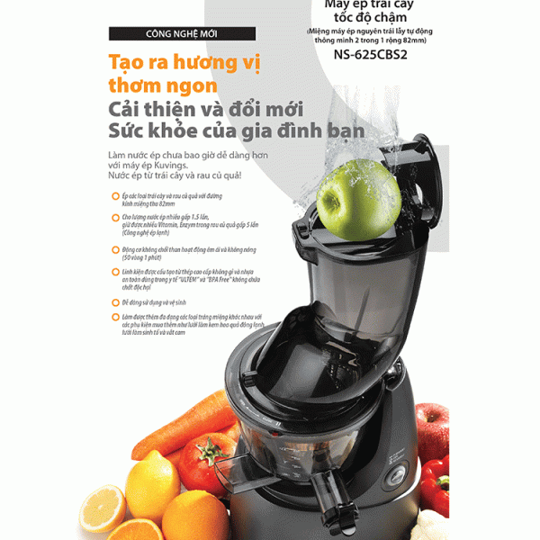 Máy ép trái cây tốc độ chậm Kuvings NS-625CBS2 với dao ép cấu tạo từ thép cao cấp không gỉ và nhựa dùng trong y tế “ULTEM”, chống ăn mòn, chống bám bẩn không sinh nhiệt cùng công nghệ ép chậm bằng lực cưỡng bức được cấp bằng sáng chế “J.M.C.S” với tốc độ ép 50 vòng/phút sẽ hạn chế quá trình oxy hóa và làm chậm quá trình tách nước của nước ép mà vẫn giữ được hương vị, màu sắc tự nhiên cũng như giữ lại được nhiều Vitamin, Enzym trong trái cây và rau củ nhiều gấp 5 lần so với máy ép truyền thống.