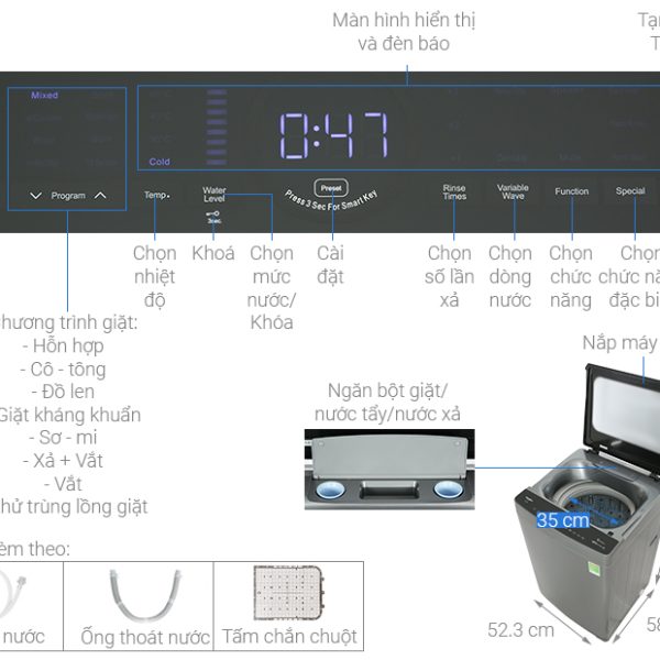 – Chương trình giặt đa dạng, giúp người dùng thêm sự lựa chọn như giặt áo sơ mi (giặt chống nhăn), đồ hỗn hợp, đồ cotton, đồ len, vắt, xả & vắt, vệ sinh lồng giặt và giặt diệt khuẩn.