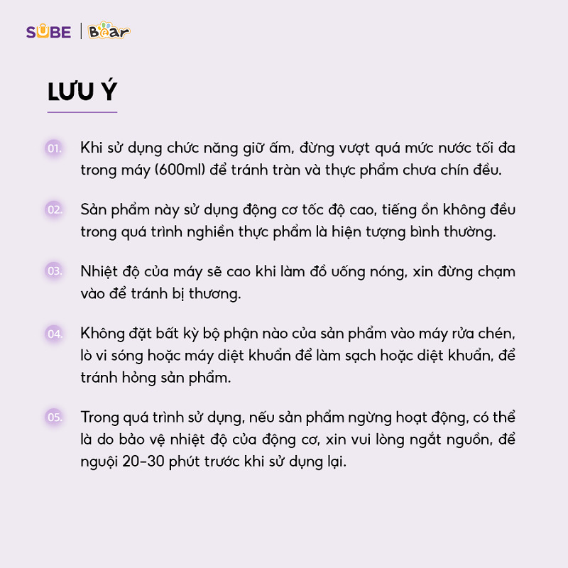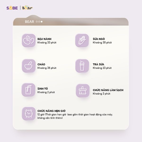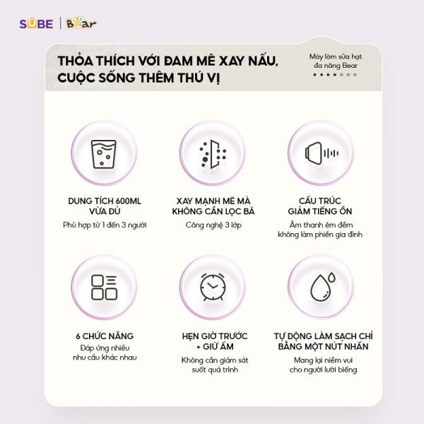 Ngoài 5 chức năng xay nấu, máy làm sữa hạt SB-SH06D còn có chức năng tự làm sạch và hẹn giờ. Sau khi nấu xong, bạn chỉ cần cho nước và chọn chế độ làm sạch, máy sẽ tự động làm sạch khoang máy sau 3 phút. Chức năng hẹn giờ của máy làm sữa hạt Bear cho phép bạn hẹn giờ trước lên tới 12 tiếng. Bạn có thể chuẩn bị nguyên liệu từ đêm, hẹn giờ và ngay khi ngủ dậy sẽ có ngay ly sữa ấm nóng để thưởng thức rồi.