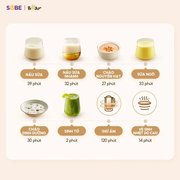 Chức năng: Nấu sữa nhanh, Nấu sữa, Cháo nguyên hạt, Sữa ngô,  Cháo dinh dưỡng, Sinh tố, Giữ ấm, Vệ sinh ở nhiệt độ cao, Hẹn giờ