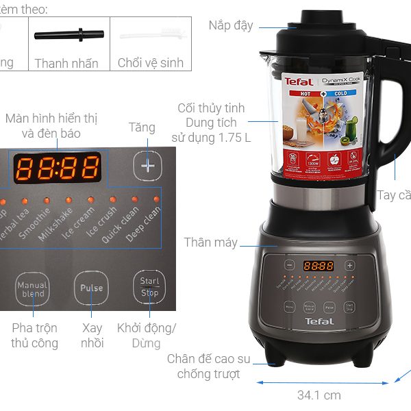 Máy được tích hợp chốt an toàn, chỉ chạy được khi nắp chốt an toàn vào đúng khớp. Máy đồng thời cũng là một công cụ để nấu sữa hạt. Bạn chỉ cần chờ đợi trong vòng 20 phút thì đã có thể thưởng thức các món sữa hạt thơm ngon bổ dưỡng và mịn nhuyễn, tăng cường đề kháng, cân bằng chất cho sức khỏe. Nắp thông hơi tiện lợi, không những có tác dụng thông hơi trong lúc nấu mà còn có thể mở và tiếp thêm nguyên liệu nếu người chế biến cần. Máy do hãng TEFAL sản xuất và có thời gian bảo hành là 24 tháng.
