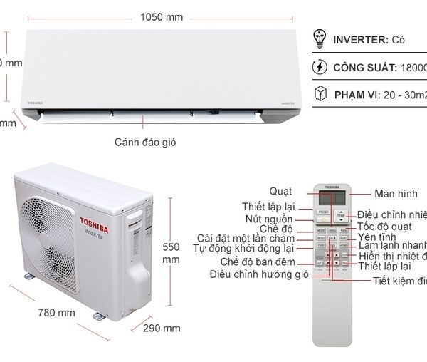 Máy lạnh Toshiba Inverter 2 Hp RAS-H18E2KCVG-V có thiết kế hiện đại và trang nhã, phù hợp với nhiều không gian nội thất. Máy lạnh có kích thước vừa phải, không quá cồng kềnh và nặng nề, giúp dễ dàng lắp đặt và di chuyển trong không gian cần làm mát.