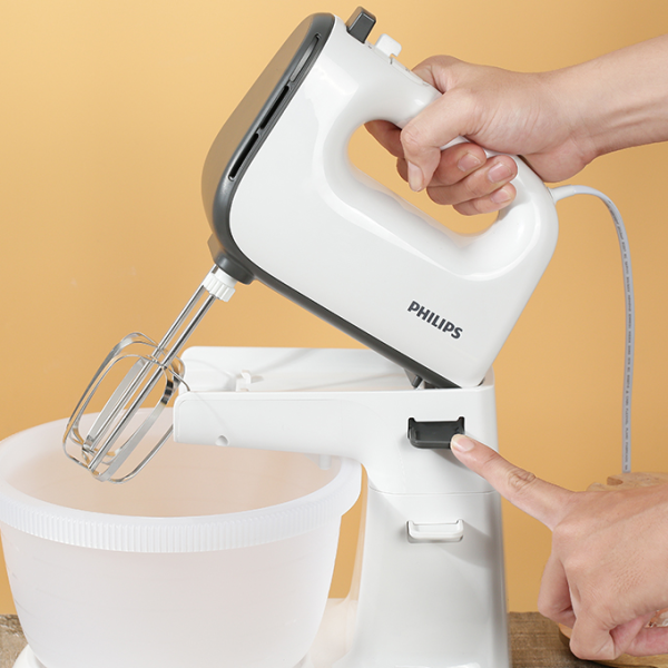 – Máy đánh trứng Philips còn trang bị nút nhấn có kí hiệu mũi tên để tháo que trộn hoặc que đánh trứng ra một cách dễ dàng.
