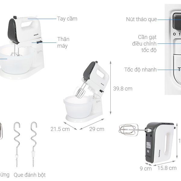 – Phụ kiện đi kèm gồm 2 que đánh trứng và 2 que đánh bột bằng thép không gỉ bền bỉ, dễ dàng tháo lắp.