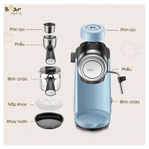 Máy pha cà phê Bear CF-B02V1 được trang bị bình chứa nước liền máy. Bình này được làm bằng nhựa PP cao cấp, có khả năng chịu nhiệt tốt, không có mùi, an toàn cho người sử dụng. Hệ thống chiết suất cafe gồm có lưới lọc, tay cầm phễu lọc. Tất cả được làm từ inox 304 không gỉ, có khả năng chịu nhiệt tốt.