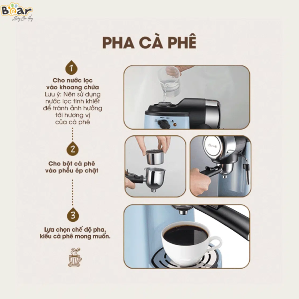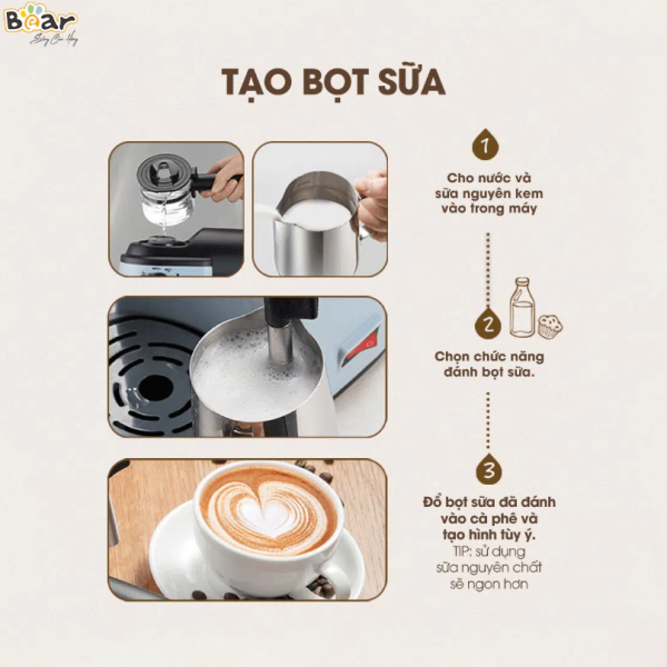 Với áp suất là 5 bar, máy pha cafe Bear CF-B02V1 chiết suất được ly cafe đầy thơm ngon với những lớp kem màu cánh gián đặc trưng của cafe pha máy. Để những ly cafe hấp dẫn hơn, thiết bị còn được trang bị thêm vòi đánh sữa tạo bọt như các dòng máy pha cafe chuyên nghiệp. Từ đó bạn có thể sáng tạo những hình thù tuyệt đẹp trên các ly mocho, latte, capuchino…