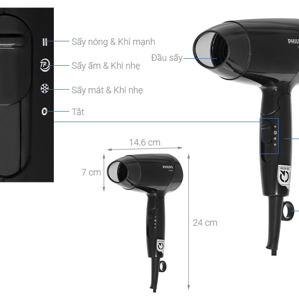 BHC010/10 sở hữu thiết kế nhỏ gọn với gam màu đen sang trọng, công suất 1200W giúp sấy tóc nhanh khô, tiết kiệm điện