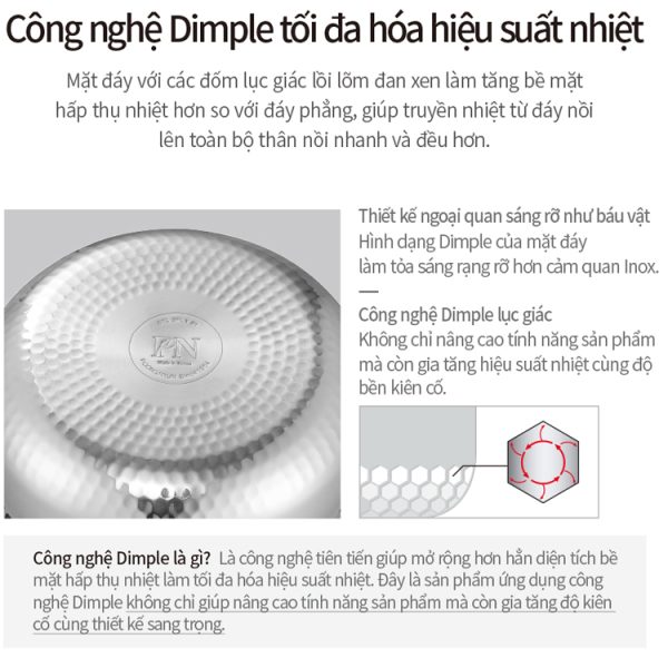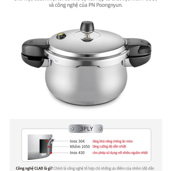 Toàn bộ cấu trúc thép không gỉ cao cấp SUS304 với 3 lớp nguyên khối (đáy và thân) [STS+ALU+STS] dầy 2.6mm của nhà sản xuất thép uy tín “POSCO” và công nghệ đáy “Dimples”, nồi áp suất Inox IH POONGNYUN [PN] HNHPC-10(IH) tối đa hóa hiệu suất dẫn và giữ nhiệt làm thức ăn chín đều cực nhanh mà thức ăn không bị cháy khét, tiết kiệm thời gian cũng như chi phí nhiên liệu nấu và giảm sự phá hủy chất dinh dưỡng trong quá trình nấu ăn một cách hiệu quả. Hơn thế nữa, với công nghệ nấu áp suất khoa học để tăng điểm sôi của nước lên 120ºC và chịu được sự gia nhiệt lên đến 400ºC làm thức ăn chín mềm nhanh hơn so với khi nấu bằng nồi áp suất điện.