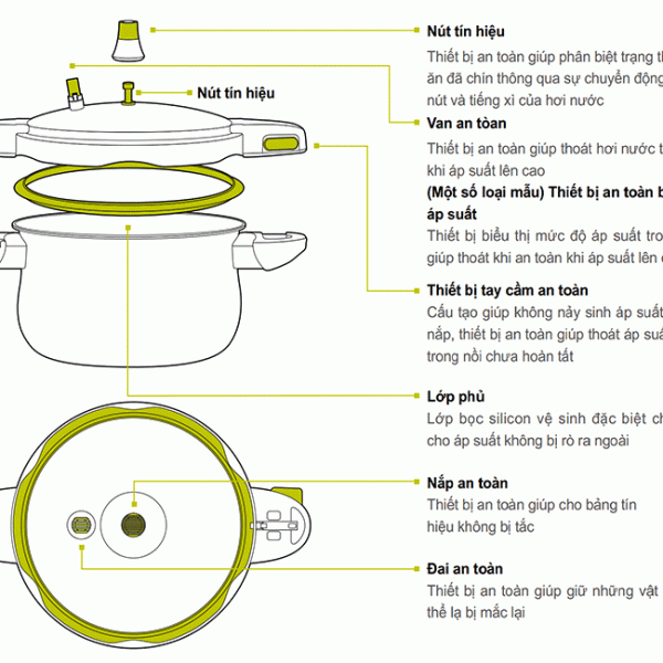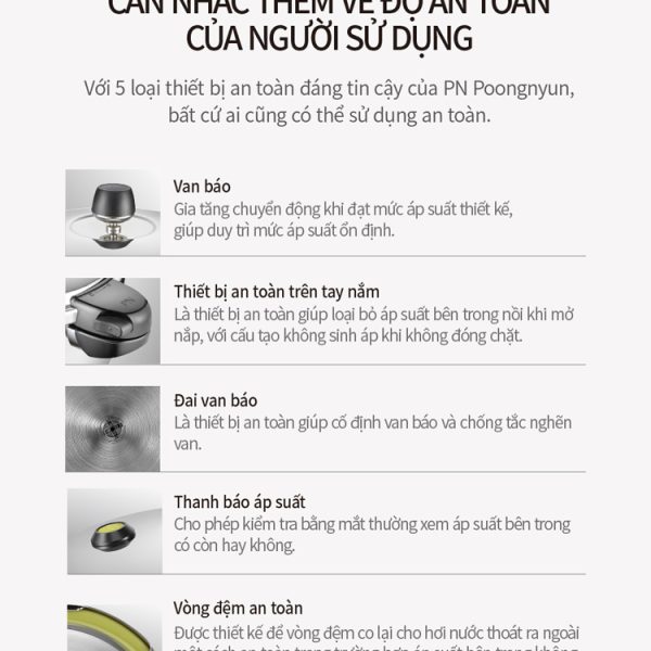 Nồi áp suất Inox IH POONGNYUN [PN] HNHPC-10(IH) với thiết kế 6 chế độ an toàn cho sản phẩm giúp bạn an tâm trong khi nấu : Khóa nắp an toàn (không tạo áp suất khi chưa đóng nắp đúng cách), Van an toàn (tự động xả hơi nếu áp suất trong nồi vượt mức cho phép do bị nghẹt bọt thức ăn ở lần nấu trước đó cũng như cảnh báo áp suất còn trong nồi hay không), Nút tín hiệu (cảnh báo áp suất còn trong nồi hay không), Nắp bảo vệ van an toàn và nút tín hiệu (ngăn không cho thức ăn làm nghẹt van), Ron (không tạo áp suất khi ron lắp không đúng cách), Van an toàn (cảnh báo cho khách hàng biết còn áp suất bên trong nồi).