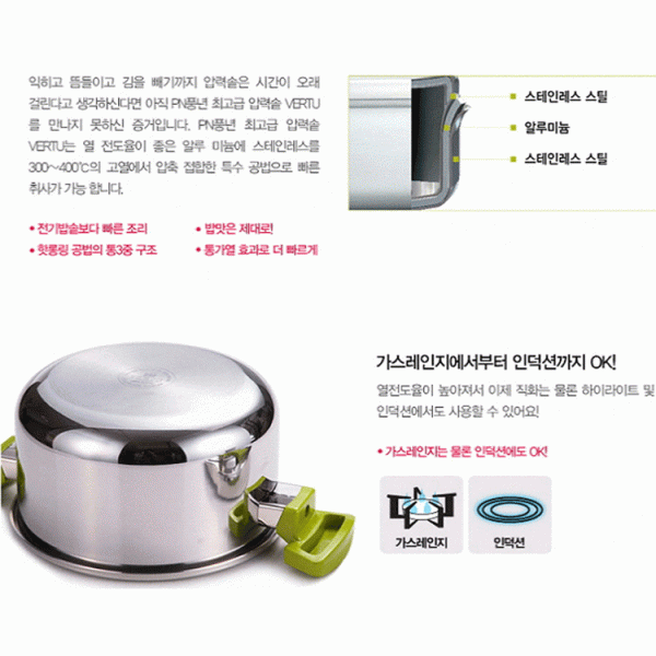 Toàn bộ cấu trúc thép không gỉ cao cấp SUS304 với 3 lớp nguyên khối thân & đáy [STS+ALU+STS] dầy 2.5mm và công nghệ đáy “U-Clad” với kỹ thuật cán nóng “Hot Rolling”, nồi áp suất Inox 3 lớp IH cao cấp POONGNYUN (PN) VTPC-22C tối đa hóa hiệu suất dẫn và giữ nhiệt nhanh hơn 9 lần làm thức ăn chín đều cực nhanh mà thức ăn không bị cháy khét, tiết kiệm thời gian cũng như chi phí nhiên liệu nấu và giảm sự phá hủy chất dinh dưỡng trong quá trình nấu ăn một cách hiệu quả.