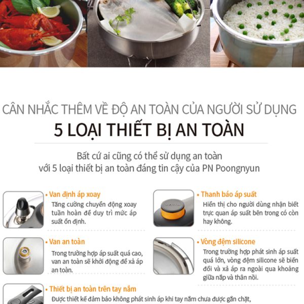 Nồi áp suất Inox từ tính POONGNYUN (PN) VTSPC-10 với thiết kế 7 chế độ an toàn cho sản phẩm giúp bạn an tâm trong khi nấu : Khóa nắp an toàn (không tạo áp suất khi chưa khóa nắp), Van an toàn (tự động xả hơi nếu áp suất trong nồi vượt mức cho phép do bị nghẹt bọt thức ăn ở lần nấu trước đó cũng như cảnh báo áp suất còn trong nồi hay không), Nút tín hiệu (cảnh báo áp suất còn trong nồi hay không), Nắp bảo vệ van an toàn và nút tín hiệu (ngăn không cho thức ăn làm nghẹt van), Ron (không tạo áp suất khi ron lắp không đúng cách), Van an toàn (tự động khóa nắp khi bên trong còn áp suất), Van an toàn (cảnh báo cho khách hàng biết còn áp suất bên trong nồi).