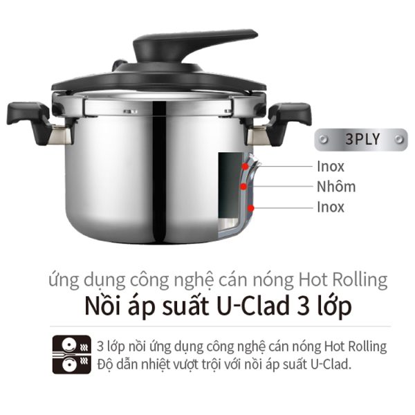 Toàn bộ cấu trúc thép không gỉ cao cấp SUS304 với 3 lớp nguyên khối thân & đáy [STS+ALU+STS] dầy 2.5mm và công nghệ đáy “U-Clad” với kỹ thuật cán nóng “Hot Rolling”, nồi áp suất Inox từ tính POONGNYUN (PN) VTSPC-10 tối đa hóa hiệu suất dẫn và giữ nhiệt nhanh hơn 9 lần làm thức ăn chín đều cực nhanh mà thức ăn không bị cháy khét, tiết kiệm thời gian cũng như chi phí nhiên liệu nấu và giảm sự phá hủy chất dinh dưỡng trong quá trình nấu ăn một cách hiệu quả. Hơn thế nữa, với công nghệ nấu áp suất khoa học để tăng điểm sôi của nước lên 120ºC và chịu được sự gia nhiệt lên đến 400ºC làm thức ăn chín mềm nhanh hơn so với khi nấu bằng áp suất điện.