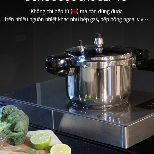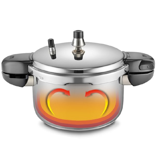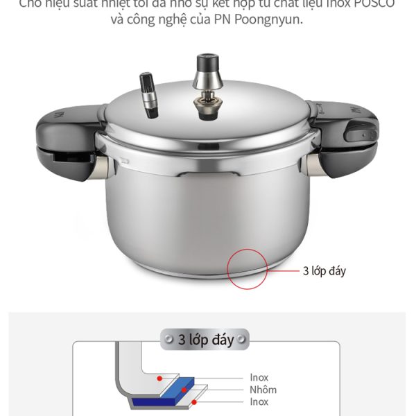 Toàn bộ cấu trúc thép không gỉ cao cấp SUS304 với đáy 3 lớp [STS+ALU+STS] dầy 3.6mm của nhà sản xuất thép uy tín “POSCO”, nồi áp suất Inox IH POONGNYUN [PN] HNVPC-06(IH) tối đa hóa hiệu suất dẫn và giữ nhiệt làm thức ăn chín đều cực nhanh mà thức ăn không bị cháy khét, tiết kiệm thời gian cũng như chi phí nhiên liệu nấu và giảm sự phá hủy chất dinh dưỡng trong quá trình nấu ăn một cách hiệu quả. Hơn thế nữa, với công nghệ nấu áp suất khoa học để tăng điểm sôi của nước lên 120ºC và chịu được sự gia nhiệt lên đến 400ºC làm thức ăn chín mềm nhanh hơn so với khi nấu bằng nồi áp suất điện.
