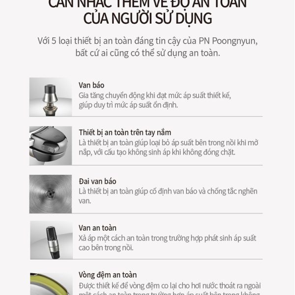 Nồi áp suất Inox IH POONGNYUN [PN] HNVPC-06(IH) với thiết kế 5 chế độ an toàn cho sản phẩm giúp bạn an tâm trong khi nấu : Khóa nắp an toàn (không tạo áp suất khi chưa đóng nắp đúng cách), Van an toàn (tự động xả hơi nếu áp suất trong nồi vượt mức cho phép do bị nghẹt bọt thức ăn ở lần nấu trước đó cũng như cảnh báo áp suất còn trong nồi hay không), Nút tín hiệu (cảnh báo áp suất còn trong nồi hay không), Nắp bảo vệ van an toàn và nút tín hiệu (ngăn không cho thức ăn làm nghẹt van), Ron (không tạo áp suất khi ron lắp không đúng cách).