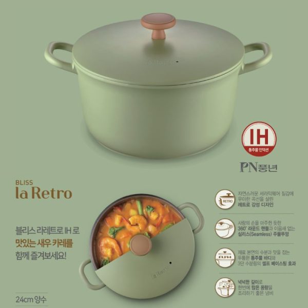 Nồi casserole Ceramic POONGNYUN (PN) Series Bliss La Retro BLRPT-24C(IH) đường kính 24 cm nhập khẩu từ Hàn Quốc thu hút ánh nhìn với thiết kế theo phong cách Châu Âu hài hòa với cảm giác sang trọng, hiện đại và tinh tế tăng độ thẩm mỹ cho nhà bếp cũng như phù hợp với nhu cầu của người sử dụng tiện lợi cho việc chế biến các món ăn khác nhau cho gia đình như hầm, luộc, kho, nấu cháo, nấu cơm, nấu cơm trộn…. Bên cạnh đó, lớp gốm ceramic cao cấp không gỉ bên ngoài giữ nồi lâu phai màu và không mau dơ.