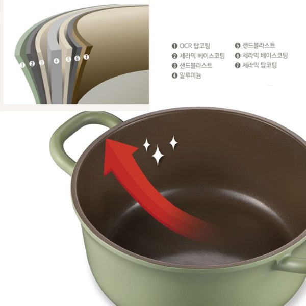 Toàn bộ cấu trúc làm bằng chất liệu nhôm tinh khiết 5 lớp được phủ 2 lớp gốm Ceramic dầy 2.5mm cực kỳ bền và không bong tróc, nồi casserole Ceramic POONGNYUN (PN) Series Bliss La Retro BLRPT-24C(IH) tối đa hóa hiệu suất dẫn và giữ nhiệt làm thức ăn chín đều cực nhanh mà thức ăn không bị cháy khét, tiết kiệm thời gian cũng như chi phí nhiên liệu nấu và giảm sự phá hủy chất dinh dưỡng trong quá trình nấu ăn một cách hiệu quả đặc biệt là các món ăn hầm và luộc.