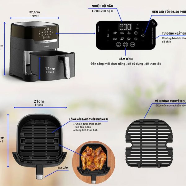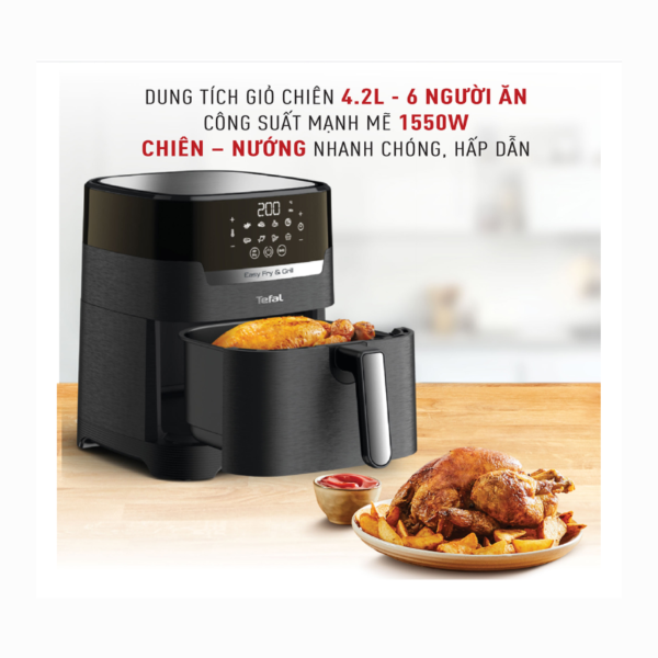 Nồi chiên không dầu Tefal EY505815 sở hữu màu sắc sang trọng, kiểu dáng bắt mắt, có dung tích nồi 4.2 lít sẽ chiên nướng được 1.2kg thực phẩm cùng lúc, giúp bạn thỏa sức nấu nướng cho gia đình mà không phải chia ra nhiều lần.