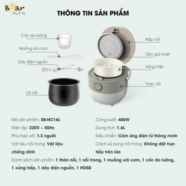Nồi cơm điện Bear 1.6L SB-NC16L không chỉ được ưa chuộng vì thiết kế nhỏ gọn, tinh tế phù hợp với nhiều không gian bếp mà còn vì các chức năng đa dạng, tiện lợi.