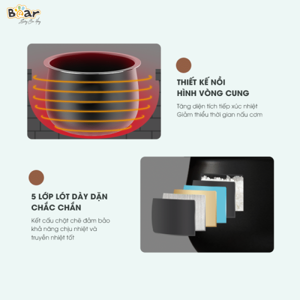 Nồi cơm điện Bear 1.6L SB-NC16L được thiết kế mô phỏng theo hình thức nấu cơm bằng bếp củi truyền thống. Thiết kế lòng nồi giúp hơi nóng tỏa đều xung quanh, nấu chín mềm hạt cơm nhanh chóng mà vẫn giữ lại được hương thơm và chất dinh dưỡng.