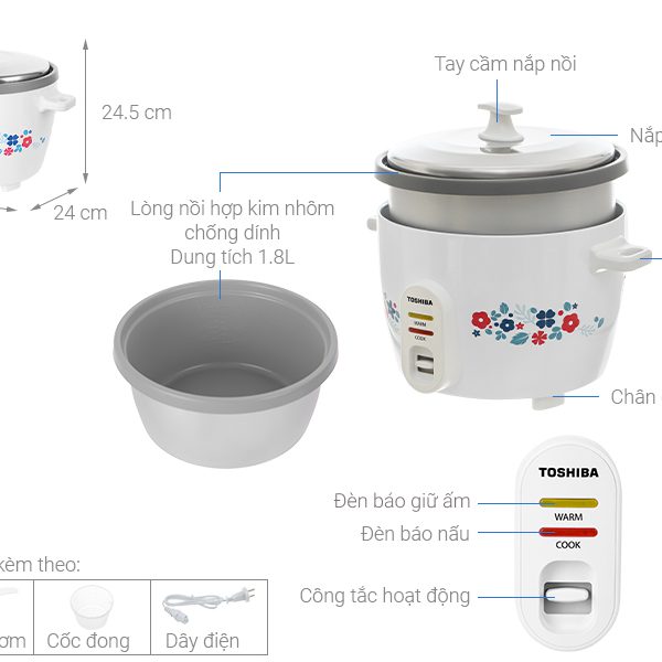 Nồi cơm điện Toshiba RC-18MH2PV(F) (1.8L) họa tiết đơn giản, trang nhã trên lớp vỏ thép sơn tĩnh điện màu trắng tinh tế, dùng đẹp cho không gian bếp