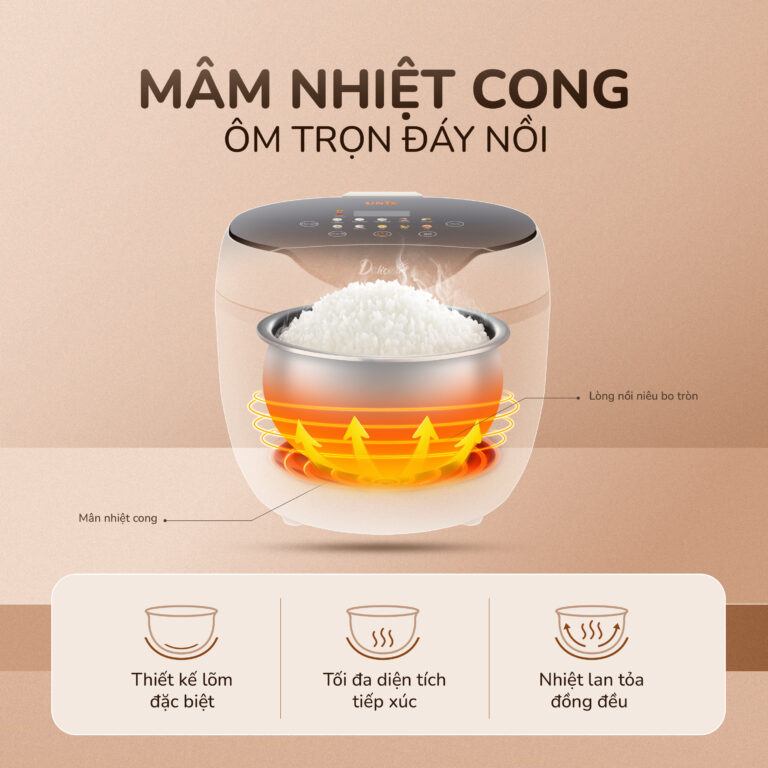 – Mâm nhiệt cong ôm trọn đáy nồi, Nhiệt lan tỏa đồng đều cho cơm chín đều và ngon hơn