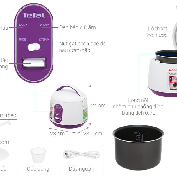 Với dung tích 0.7 lít cùng 3 chức năng cơ bản gồm nấu cơm, giữ ấm và hấp, nồi cơm nắp gài Tefal 0.7 lít RK224168 sẽ là sự lựa chọn hoàn hảo cho các gia đình nhỏ có 1 – 2 thành viên