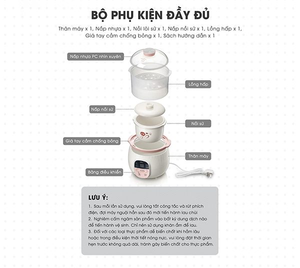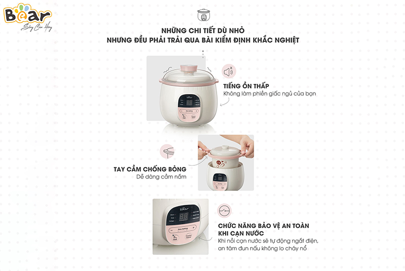 Không chỉ đảm nhiệt tốt việc nấu cháo, nồi nấu chậm Bear SUBE001 còn được trang bị tới 6 chức năng để bạn có thể chế biến nhiều món khác nhau như: hầm canh, nấu chè, hấp, luộc, chưng yến… Chính vì thế mà thiết bị này không chỉ phục vụ bữa ăn dặm cho bé mà còn phù hợp với người già, những đối tượng muốn tìm tới một giải pháp tiện lợi để bữa ăn hằng ngày thêm chất lượng.