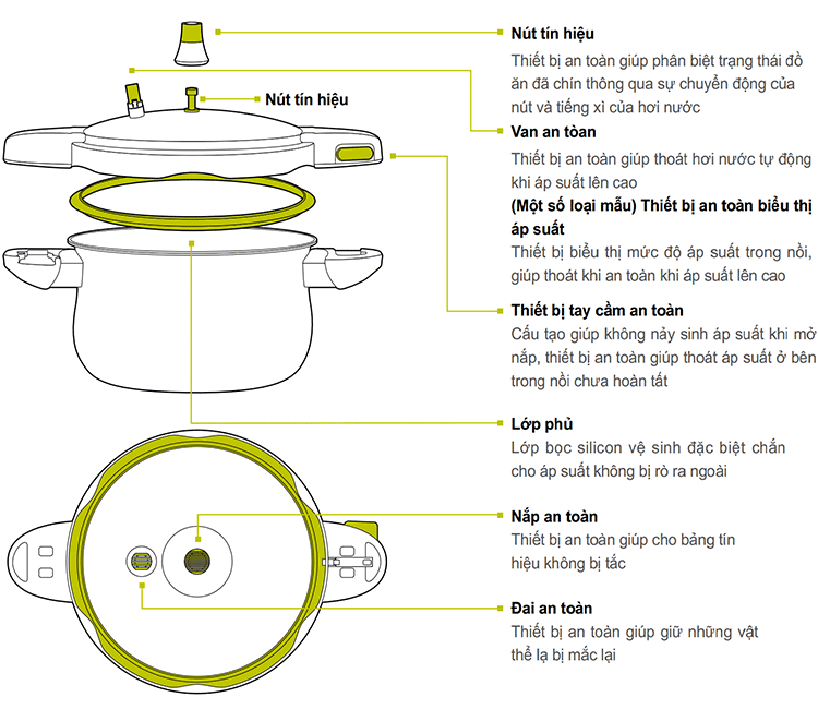 Nồi áp suất Inox IH POONGNYUN [PN] HNVPC-10(IH) với thiết kế 5 chế độ an toàn cho sản phẩm giúp bạn an tâm trong khi nấu : Khóa nắp an toàn (không tạo áp suất khi chưa đóng nắp đúng cách), Van an toàn (tự động xả hơi nếu áp suất trong nồi vượt mức cho phép do bị nghẹt bọt thức ăn ở lần nấu trước đó cũng như cảnh báo áp suất còn trong nồi hay không), Nút tín hiệu (cảnh báo áp suất còn trong nồi hay không), Nắp bảo vệ van an toàn và nút tín hiệu (ngăn không cho thức ăn làm nghẹt van), Ron (không tạo áp suất khi ron lắp không đúng cách).
