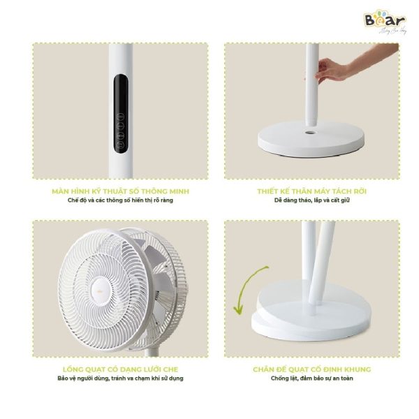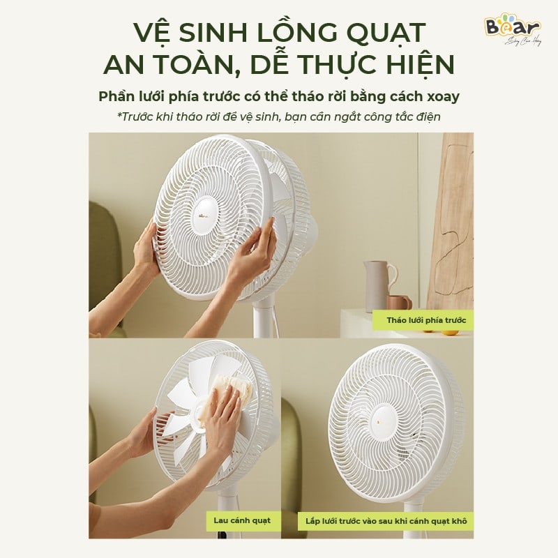 Quạt cây thông thường khá khó tháo lắp và khó vệ sinh do có nhiều chi tiết nhỏ. nhưng với Bear SB-QC47K thì hạn chế này đã được khắc phục. Quạt tháo ra, lắp vào đơn giản lại chắc chắn. Quạt được làm từ chất liệu cao cấp, mềm mịn, ít bám bụi lại dễ vệ sinh.