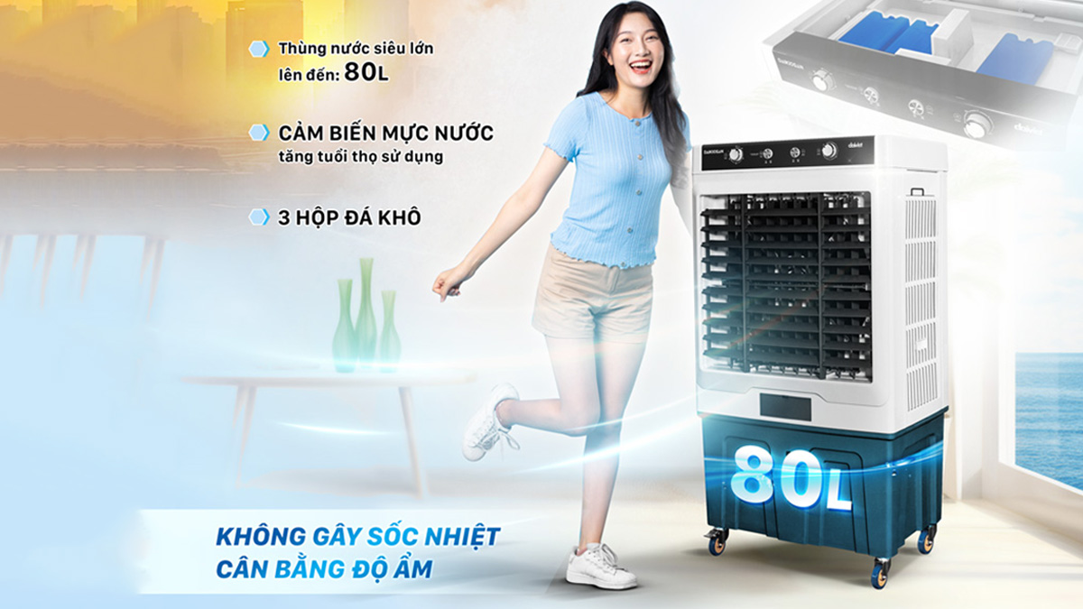 Sản phẩm có dung tích bình chứa nước lớn lên đến 80 lít, đáp ứng tốt nhu cầu làm mát cho gia đình bạn trong thời gian dài mà không cần phải châm nước thường xuyên. Đặc biệt, thiết bị còn đi kèm với 3 hộp đá khô giúp làm lạnh nhanh chóng trong thời tiết mùa hè nóng bức.