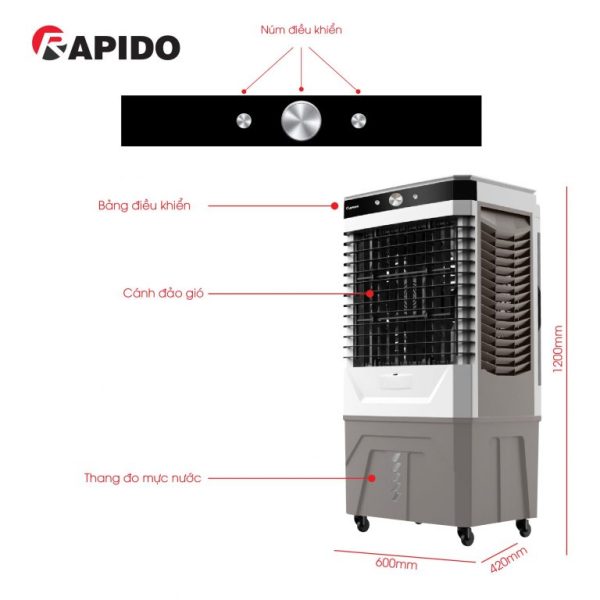 Quạt điều hòa Rapido Everest 9000M có kích thước 60cm x 120cm (Ngang x Cao), thiết kế hiện đại, phù hợp với nhiều phong cách nội thất.