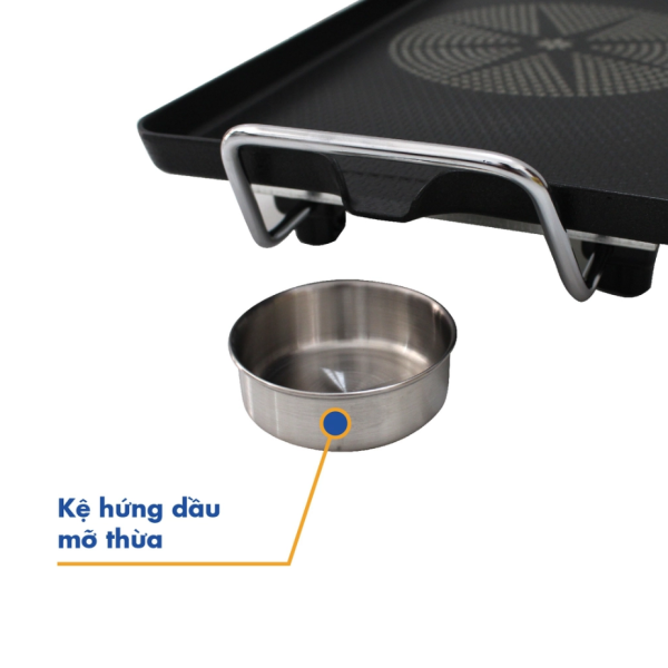 Vỉ được trang bị thêm chén hứng dầu, mỡ thừa và chân gạt nghiêng tiện lợi giúp bạn dễ dàng trút dầu thừa ra khỏi vỉ.